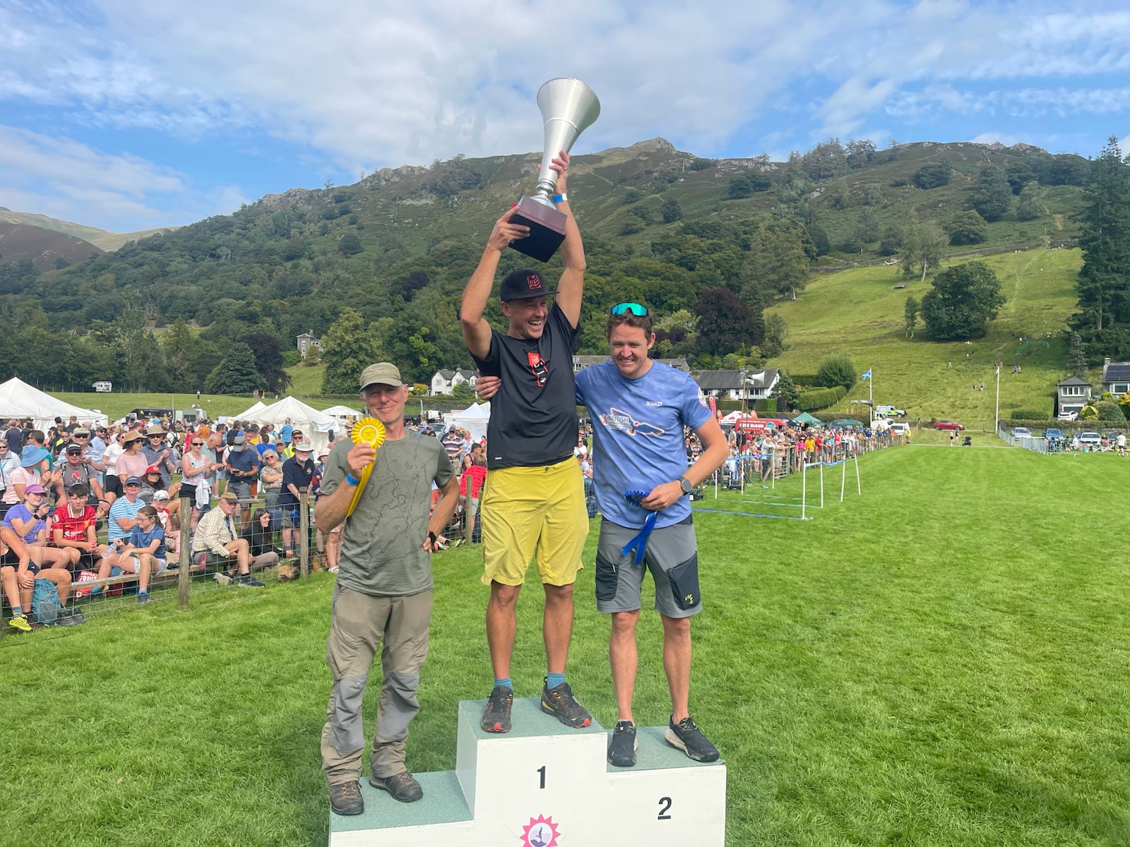 The finishing podium at the Grasmere Show Hike & Fly race on 24th August 2025. Tom Hodgkin came first, Richard Mackie second, and Dangerous Dave Ashcroft third. Pic by John Westall.
