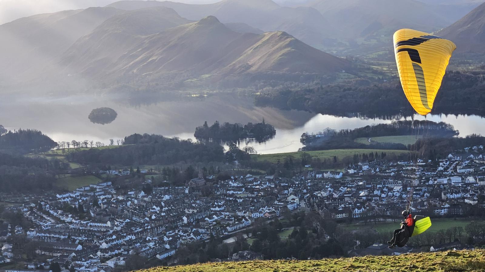 | February's Picture | Mike Williams landing on Latrigg on 12th December with his Ozone SwiftSix after a flight from Skiddaw Little Man. Photo by Chris Little. | |