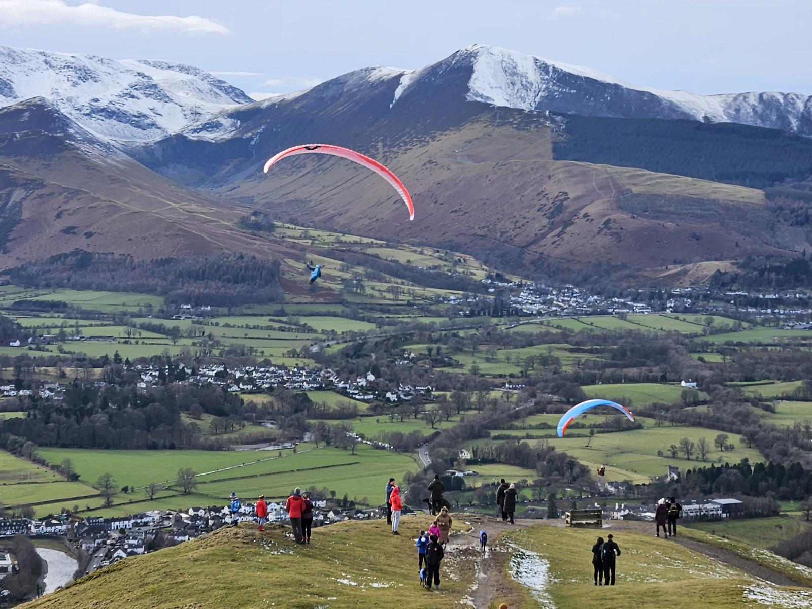 | March's Picture | Jan Little & Richard Sewell flying above Latrigg on 14th February during a rare break in the month’s weather. Pic by Chris Little | |