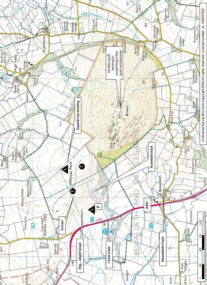 | IMPORTANT - Restrictions on use | SITE ACCESS: - Permission to fly no longer required BUT there is still a £1 site flying fee (per pilot per day). Put your money in the CSC honesty box located at the main accesss gate (see photo 1). - The site entrance gate may have a combination lock (see photo 2, note code position); get the code from Gordie Oliver (07830 281986), or the site officer or the Sick and the Wrong. Please keep the code confidential. Otherwise park in the huge lay-by across the main road (A591) from the site entrance and walk up. PARKING: The MotoX track is being revamped, they have re-seeded the ground to the right (south) of the large rock at the entrance of their area. They have requested that we park on the left (north) of the track, closer to the hill (see photos 2 & 3). TRAINING: Note that this is an essential site for training and schools using the site have priority. While there may be scope for other pilots to fly, numbers may be limited. If you are a qualified pilot, please allow space and priority for training. BINSEY: This is the large hill SE of Whittas Park (see map below). It is an active grouse moor with a gamekeeper and owners who actively oppose wildlife disturbance...... Please DO NOT LAND OR TAKE OFF FROM anywhere in the whole fenced Binsey area, unless an emergency. NESTING BIRDS & AERO MODELLERS: Avoid the NW end of the site during the nesting season and if model aircraft flyers are using it. DOGS: No dogs allowed on the flying site without permission. |