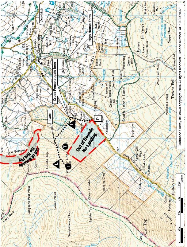 IMPORTANT - Restrictions on use | A new (2015) fence has been erected immediately after the second gate and crosses the boggy area before going up the hill. You used to stay to the right of a derelict wall before crossing over the wall before starting up the hill. Please use the new gate (see site map) on the left immediately after going through the second gate as there is no way through further on. The farmer is quite OK with our activities but asks that we don't climb over walls and fences. Take off at the very top of the hill. Alternatively, you can use the field to the left of the walk up path - there's a small group of trees in this field not far from the fell wall. NO SCRATCHING near to sheep and lambs - stay well away from all livestock. There is a number limit of ten people on the fell, flying or otherwise. DO NOT walk through, land in or over-fly the field marked as 'out of bounds'. No flying is permitted within two hundred metres of the Combe (NE bowl) during the nesting season. Limited roadside parking. DO NOT obstruct the road or field gates. No school use. |