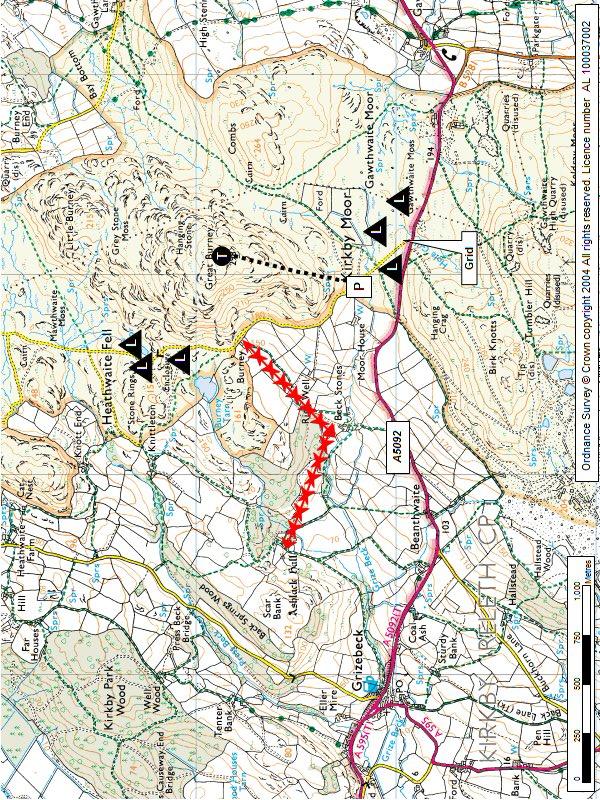 Be aware of the wind turbines behind the ridge/quarry at Burlington. Public telephone at Grizebeck (800m west) and at Gawthwaite (400m east). Adjacent to the busy A5092(T). Power lines cross the fields below the site.