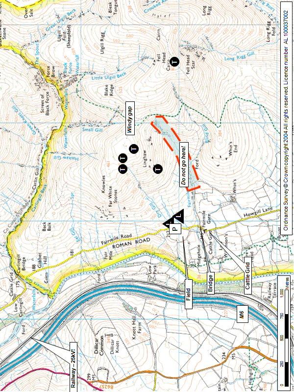 Best approached from the A685 between Tebay and Kendal. From the north, leave the M6 at J38 and take the right turn at the roundabout from Tebay. Approx. 4km south of Tebay the road goes over the motorway and the road swings downhill on a left hand bend. Turn left passing under the railway and motorway heading for Carlingill. Don't be tempted to follow the road into the farmyard, you need to turn left immediately before the farm buildings. Follow the narrow tarred road approx. 3km. - after 500m you cross the Lune river and then steadily up the hill for 1500m past a farm on the left. The road turns sharply to the left and then over a cattle grid. Sharply right over Carling Gill bridge and then across the open fell road. When you see a wall on the right look out for and park on the left at the grassy pull in area at the foot of Linghaw Fell. In 2013 there is currently a large tree root which someone has plonked in the parking area. Some holes have been drilled in it and it makes a good windsock base.